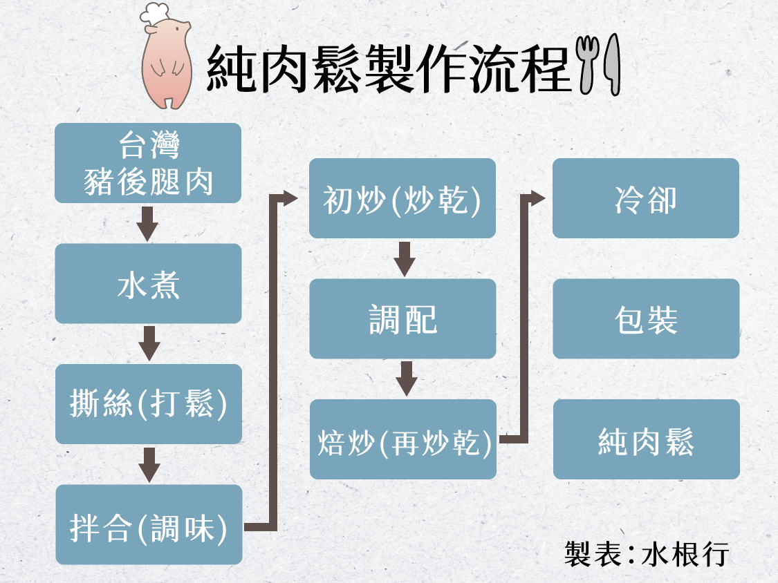 純肉鬆的製程大致上就是將肉炒乾,步驟其實相當繁瑣,首先,後腿肉要經過水煮,再將肉的纖維打鬆,進行拌合調味,放入炒鍋中不斷翻炒將水分移除,炒乾後需要冷卻,才能進行最後包裝。