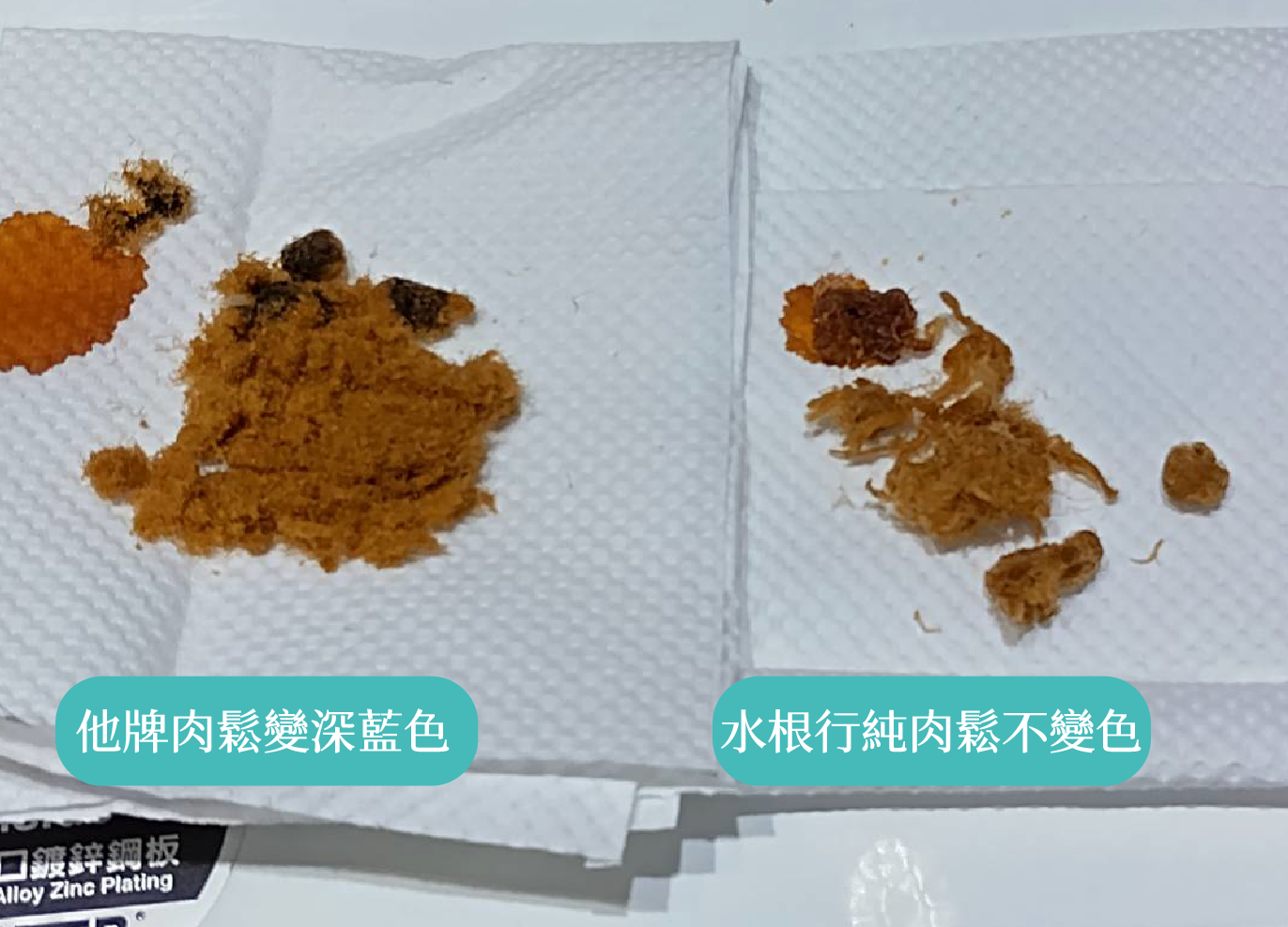 7.可以用把碘液加入肉鬆中,碘液遇到澱粉會變成藍綠色或深藍色,表示裡面含有豌豆粉(澱粉),如果還維持金黃色就表示肉鬆中是肉(蛋白質)。