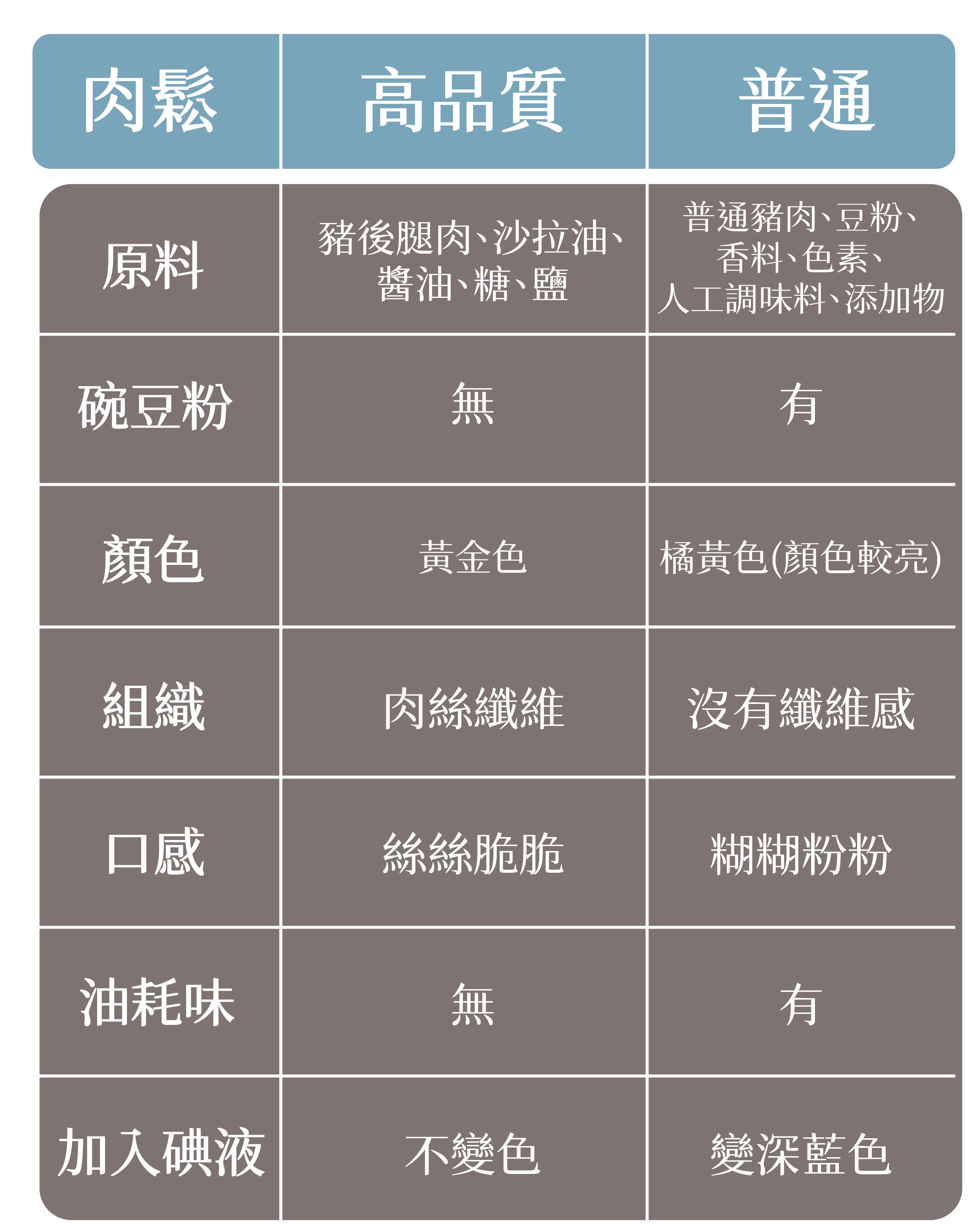1.品質好的肉鬆在製作時,只會有豬後腿肉、沙拉油、醬油、糖、鹽等簡單成分。