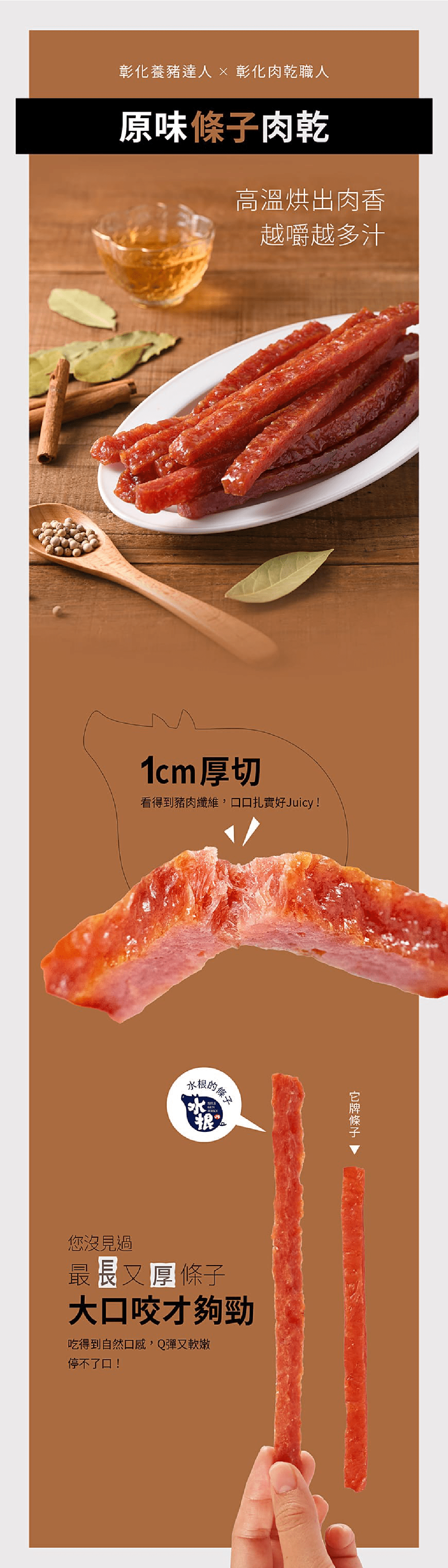 *嚴選台灣CAS豬後腿肉,採用天然辛香料與金門高粱酒調味,襯托出豬肉的本身甘甜。獨創兩段式烘烤技術,去除油膩鎖住肉汁,搭配條狀肉乾設計Q彈口感讓人欲罷不能,讓你體驗隨手拿著一條,方便容易上口。