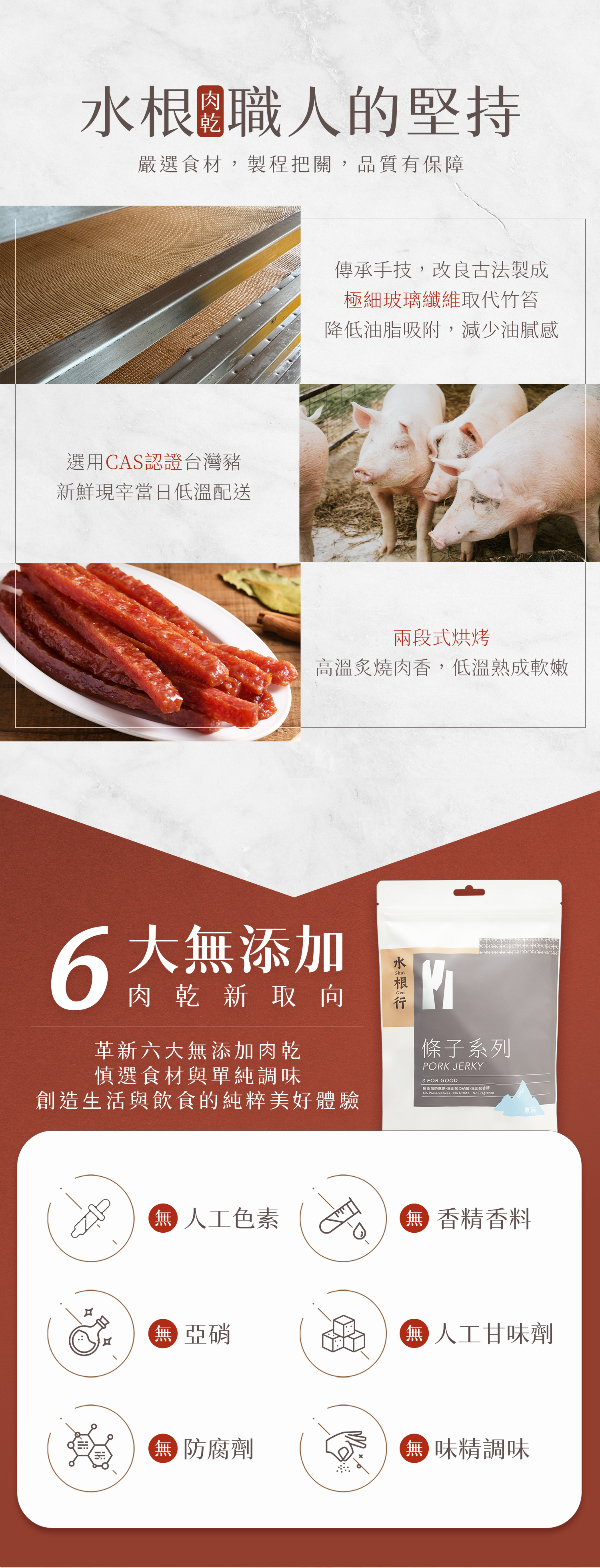 *嚴選台灣豬後腿肉,採用天然辛香料與金門高粱酒調味,襯托出豬肉的本身甘甜。獨創兩段式烘烤技術,去除油膩鎖住肉汁,搭配條狀肉乾設計Q彈口感讓人欲罷不能,讓你體驗隨手拿著一條,方便容易上口。
