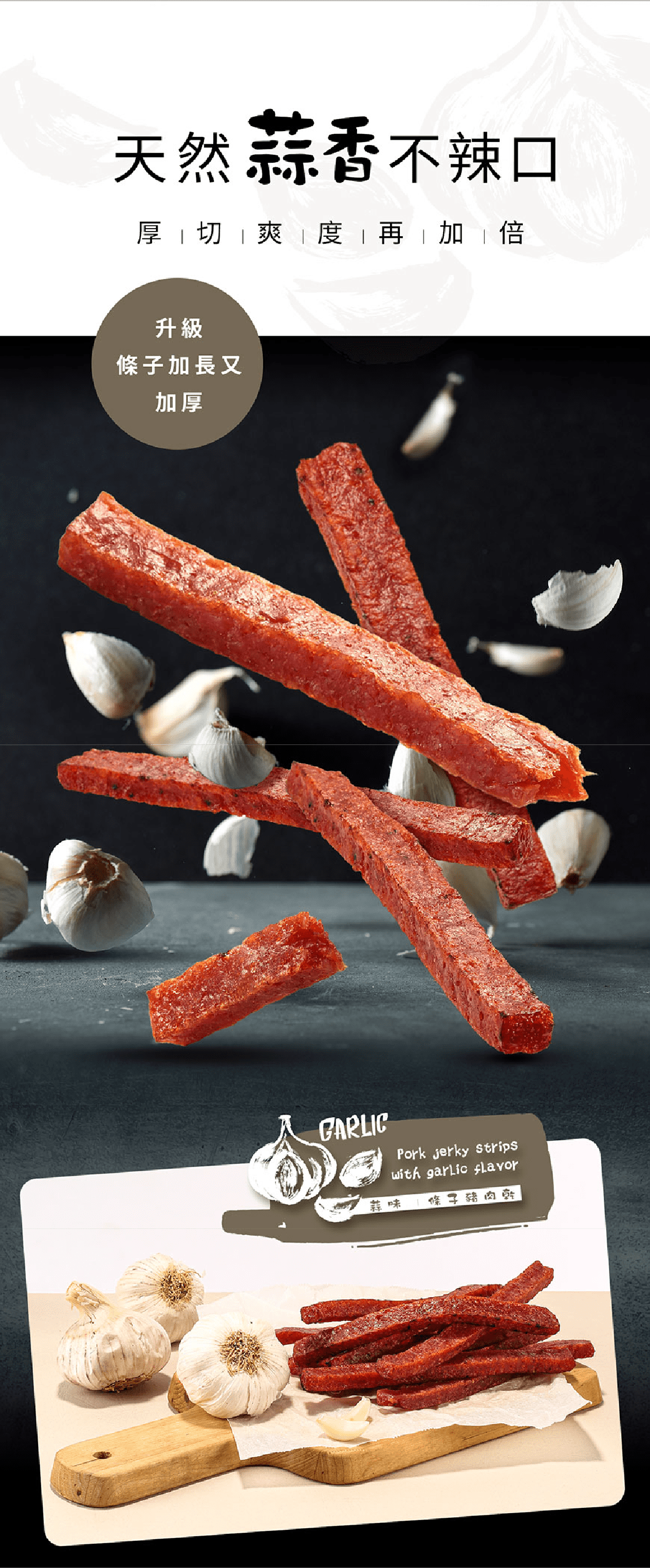 *嚴選台灣CAS豬後腿肉,搭配台灣在地蒜頭100%不添加蒜精,以天然蒜泥醃製入料。一咬下去濃濃蒜香在嘴裡引爆,熱愛蒜香的人不容錯過的好滋味。