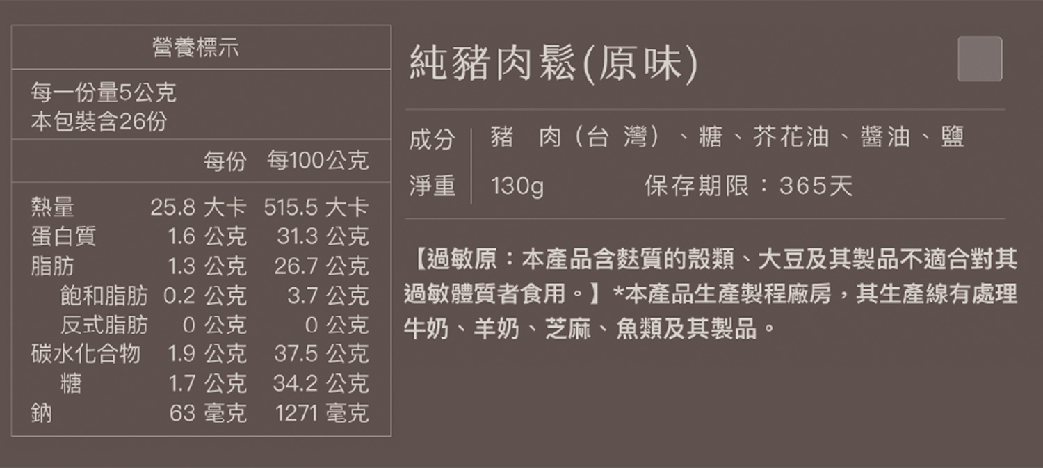 選用台灣豬標章安心認證之永隆牧場花田喜彘-『胡蘿蔔豬』後腿肉,並以手工捶打、撥絲,保留其纖維以增加口感,採用自然原料調味,
