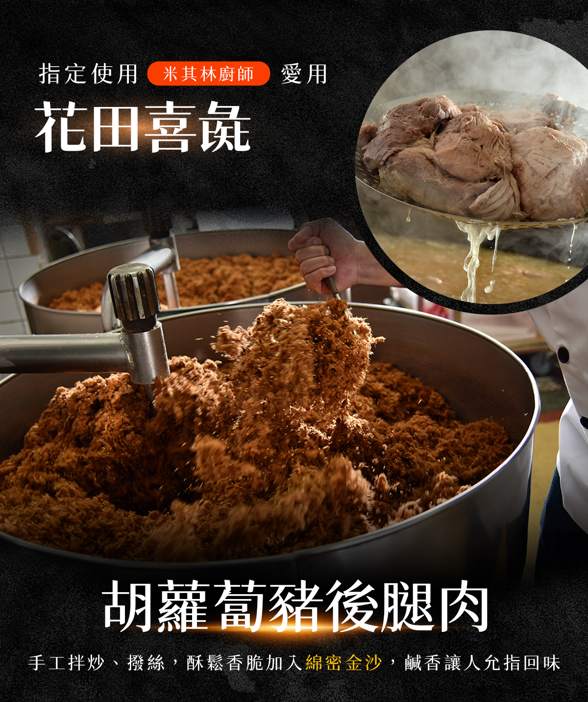 獨家乾燥技術濃縮鴨蛋營養,搭配手工撥絲豬肉、慢火拌炒,