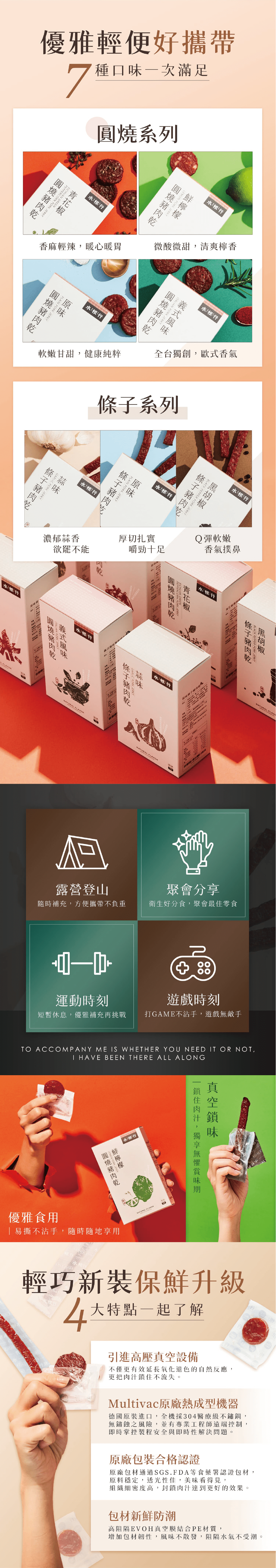 內容物:新食感_圓燒豬肉乾-台味醬燒(分享盒)+新食感_圓燒豬肉乾-青花椒(分享盒)+圓燒豬肉乾-檸檬(隨行盒) +條子豬肉乾-蒜味(隨行盒)
