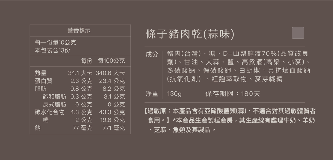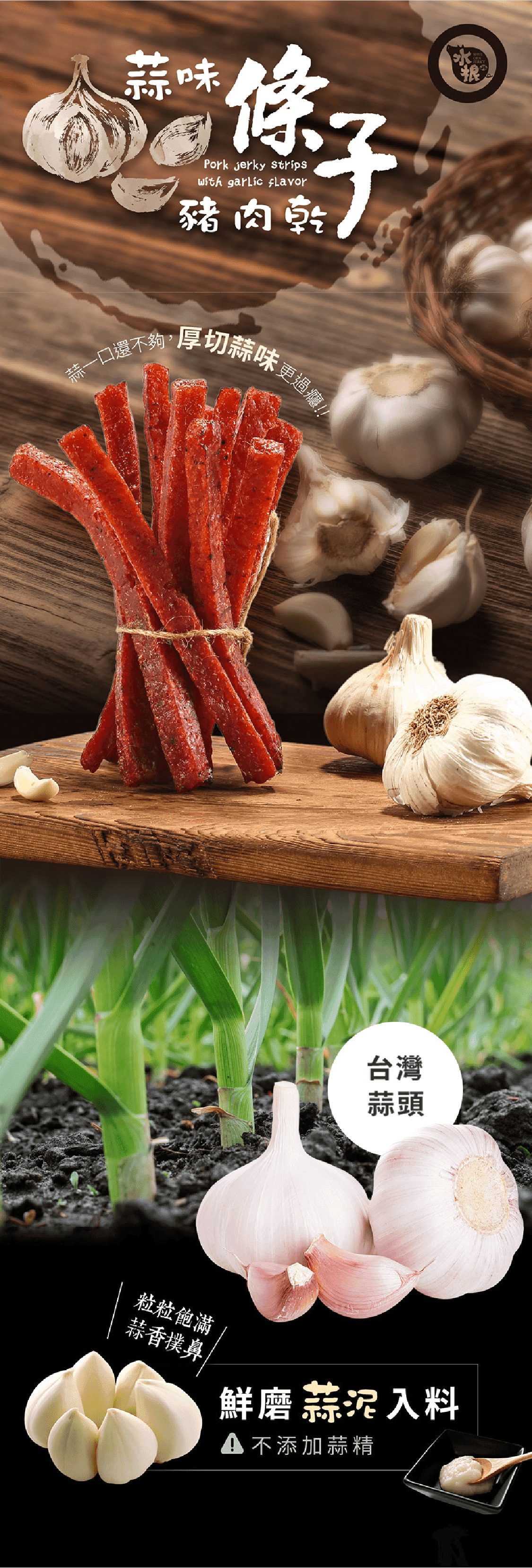 採用彰化在地蒜頭,不添加蒜精,天然蒜泥醃製入料,一咬下去濃濃蒜香在嘴裡引爆,熱愛蒜香的人不容錯過的好滋味。
